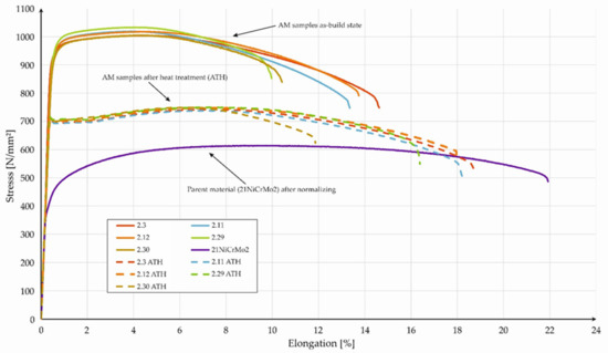 Stress-strain curves of the PBF-LB/M samples (as-built and after heat-treatment—AHT) compared with the parent materials (after normalization).