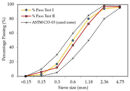 Sand grading curve of fine river sand with ASTM-C33 upper and lower limits.