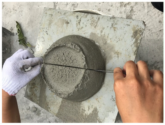This experiment was carried out to find out how adding PFF affected the foamed concrete flow and workability. Using an extended cylinder, spreadability was used to determine the workability (diameter of 76.2 mm × height of 152.4 mm). This apparatus was used following Brewer’s open-ended cylinder spread procedure [22,23]. Once the foamed concrete stopped flowing, the average spread diameter of the mixed foamed concrete was calculated. The measurement of foamed concrete’s spreadability is shown in Figure 3.