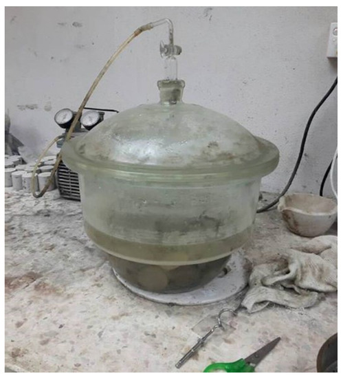 The number of pores in foamed concrete is commonly stated as a percentage of volume. The porosity of foamed concrete affects many different aspects of its mechanical, thermal, and durability properties. Additionally, it allows several dangerous substances into the foamed concrete. Salt will corrode the reinforcing bar in reinforced foamed concrete, and rust will grow and cause the foamed concrete to crack. Determining the porosity of foamed concrete with a polyformaldehyde monofilament membrane is therefore critical. As shown in Figure 4, the vacuum-saturated method was used to conduct the porosity test [24]. The cylinder specimens used in casting had diameters of 45 mm and heights of 50 mm. On day 28, this test was executed by placing the foamed concrete samples inside a vacuum desiccator.