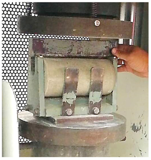 Foamed concrete’s splitting tensile strength is one of the essential and crucial qualities that significantly affects the depth and breadth of cracks in the material. Because of its brittleness and poor tensile strength, a foamed concrete specimen is not often anticipated to bear direct tension. In this research, the splitting tensile strength test was carried out in line with BS EN 12390-6 specifications [28]. The test was performed on a cylinder of foamed concrete, 100 mm in diameter by 200 mm in height, on days 7, 28, and 56. The splitting tensile strength test setup is displayed in Figure 7.