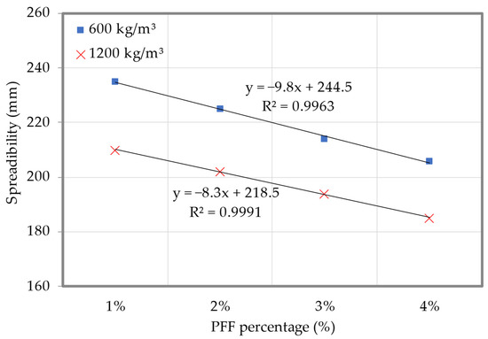 Figure 8 displays the results of the spreadability for both densities examined in this study (the dataset can be found in Appendix A, Table A2). Figure 8 shows that the self-flowing ability of all the foamed concrete mixes was excellent, with a spreadability greater than 187 mm. Spreadabilities of 255 mm and 230 mm were recorded for the 600 and 1200 kg/m3 densities of the control specimens, respectively. Spreadability was reduced by adding PFF to foamed concrete, and this effect was proportional to the amount of PFF added. Foamed concrete mixes with 4% PFF had the lowest spreadability when compared to the other foamed concrete mixes. Spreadabilities were measured to be 206 mm for 600 kg/m3 and 187 mm for 1200 kg/m3. Because PFF tends to absorb water, there is a consistent decrease in spreadability when it is are present; the external segment of PFF presents significant porosity, which benefits the bond to the matrices, and thus the spreadability of the foamed concrete decreases. In addition, the cementitious matrices aggregate on the PFF’s large specific surface area, increasing the foamed concrete’s viscosity and causing a decrease in spreadability at greater PFF weight fractions. As the air bubbles are forced out of the cementitious matrix, the slump diameter of the foamed concrete will decrease as a result of the free flow of the intermittent stage above the capacity of the stable spreading form. Mortar must additionally cover the smooth PFF membrane in addition to the fine filler (sand). The spreadability of foamed concrete was reduced as the percentage of PFF was raised from 1% to 4%, indicating that greater quantities filling mortar was required to cover the additional zone of PFF. Furthermore, PFF increases the inner abrasion between foamed concrete components, which in turn causes more cement matrix to diminish the inner resistance, hence reducing the workability of foamed concrete. A similar finding, that increasing the fiber’s weight fraction in concrete reduced its workability, was previously described by Mohseni et al. [29].