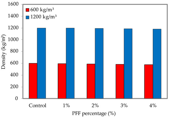 Differences in the dry density of foamed concrete as a function of PFF weight % are shown in Figure 9 (the dataset can be found in Appendix A, Table A2). According to the findings, the dry density of foamed concrete decreases from that of the control foamed concrete across all three densities when the weight percentage of PFF increases from 1% to 4%. It was discovered that the foamed concrete dry density was highest when PFF was included at a rate of 0% (control specimen), and lowest when PFF was included at a rate of 4%. The decrease in dry density of LFC, combined with larger weight fractions of PF, was caused by difficulties in the compaction process. These resulted in absorbent LFC, resulting in a lower dry density of LFC as linked to the control specimen. Final dry densities were acceptable, falling within the range of 50 kg/m3 for all foamed concrete mixes that included PFF in different percentages. For instance, for mixes PF0%, PF1%, PF2%, PF3% and PF4%, the discrepancies between final dry densities and planned dry densities of 600 kg/m3 density were ±2 kg/m3, ±5 kg/m3, ±10 kg/m3, ±19 kg/m3 and ±24 kg/m3, respectively. The foamed concrete properties are entirely reliant on the dry density [30].