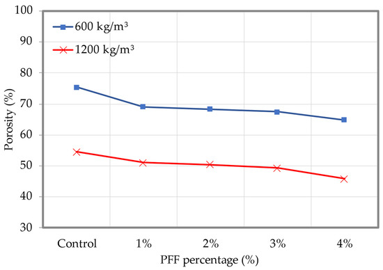 The porosity of foamed concrete with increasing PFF percentages is represented graphically in Figure 10 (the dataset can be found in Appendix A, Table A2). Generally, the inclusion of PFF in foamed concrete results in a gradual increase in the material’s porosity, which reaches the highest value with a 4% addition of PFF. When contrasted with the control foamed concrete sample, the foamed concrete mix with 4% PFF obtained the optimal values of porosity, with around 13.9% and 15.9% decreases in porosity for 600 and 1200 kg/m3 densities, respectively. It is possible that this is because of the high packing capacity that PFF has in the cementitious matrix of foamed concrete. A porosity value of 64.9% was observed for the foamed concrete mix, with a density of 600 kg/m3 and a percentage of PFF of 4%, whereas a porosity value of 75.4% was recorded for the control sample. Microcracks formed on the surface of the foamed concrete while it was still in its fresh state condition. At the same time, the surface moisture was rapidly evaporating, which resulted in significant dry shrinkage. When PFF is added to foamed concrete mixes, the segregation can be reduced, and this also helps to reduce the amount of water that is lost through evaporation. In addition to this, the use of PFF has been shown to effectively stop the spread of cracks in foamed concrete that start on the surface and move inward [31]. The morphology of the control foamed concrete specimen, which has a density of 1200 kg/m3, is shown in Figure 11a. It was clear that there were a great number of huge pores that were attached to one another, which resulted in a high porosity value. With the presence of 4% PFF, the compactness of the foamed concrete is improved, and the number of pores that are both large and interconnected is reduced significantly. As the PF was incorporated into the cementitious matrix, as seen in Figure 11b, the internal structure became denser and a homogenous microstructure was achieved, all while decreasing the foamed concrete porosity value.