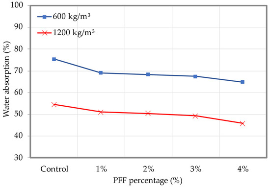 The findings of foamed concrete’s water absorption with various PFF percentages are shown in Figure 12 (the dataset can be found in Appendix A, Table A2). It was clear that as PFF percentages increased from 1% to 4%, the foamed concrete’s ability to absorb water increased as well. For both densities examined in this study, the inclusion of 4% of PFF resulted in the highest water absorption. It should be noted that less cracking occurs in foamed concrete when PFF is added to the mix, and the cracks that do form are smaller and finer than they are in foamed concrete without PFF. This suggests that the presence of PFF can significantly increase foamed concrete’s capacity to absorb water and significantly reduce the risk of microcrack merging [32]. Ramezanianpour et al. [33] explored the impact of polypropylene fiber percentages ranging from 0.5% to 4.0% on concrete water permeability. They discovered that adding polypropylene fiber decreased the extent of concrete water penetration. The effect of multi-size polypropylene fibers on the impermeability of concrete was analyzed by Guo et al. [34]. They discovered that, whereas coarse fibers had more obvious macropore inhibition effects on concrete, small fibers had noticeable inhibition on micropores. Additionally, the impenetrability of foamed concrete made with coarse and fine polypropylene fiber is higher than that of foamed concrete made with single-diameter polypropylene fiber. Behfarnia and Behravan [35] evaluated the concrete’s ability to absorb water between 0.4% and 0.8% steel fiber and polypropylene fiber. They discovered that the presence of polypropylene fiber diminished the concrete’s capacity to absorb water by up to 45%, indicating that concrete’s impermeability was greatly increased.