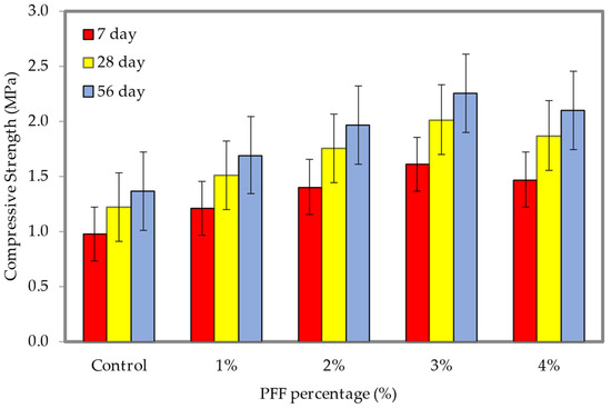 Compressive strength of foamed concrete of 600 kg/m3 density with varying PFF percentages.