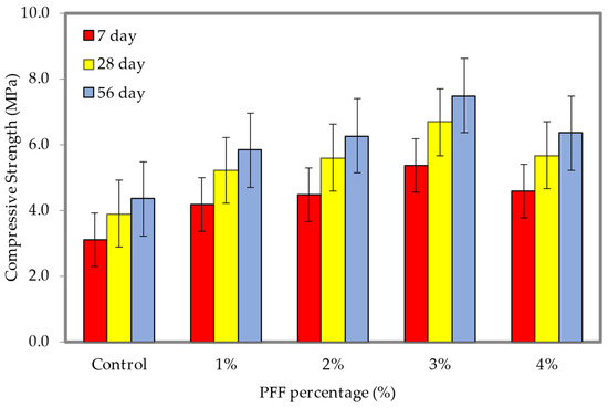 The compressive strength results of 600 and 1200 kg/m3 densities, corresponding with the insertion of various percentages of PFF, are shown in Figure 14 and Figure 15 (the dataset can be found in Appendix A, Table A1). Generally, adding PFF to foamed concrete limited in the growth of the material’s compressive strength. For both densities, the optimal percentage of PFF was 3%. PFF was added to foamed concrete, which resulted in a decrease in the amount of entrapped air voids, capillary pores, and entrained air voids. All three of these factors contribute to a rise in the foamed concrete compressive strength. The compressive strengths of the foamed concrete on days 7, 28, and 56 with the inclusion of PFF were greater than the control specimen strength, regardless of the density of the foamed concrete. In comparison to the control specimen, which only achieved compressive strengths of 1.37 MPa (600 kg/m3) and 4.34 MPa (1200 kg/m3), the optimal compressive strengths achieved on day 56 were 2.26 MPa and 7.83 MPa, with the inclusion of a 3% and 4% weight fraction of PFF for the 600 and 1200 kg/m3 densities, respectively. When an optimal percentage of PFF is evenly scattered in foamed concrete cement paste, the hydrated products of cement amass around the PFF. This is due to their superior surface energy, as their surface behaves as a nucleation site. As the foamed concrete contracts, the PFF membrane absorbs tensile energy through the boundary between the PFF and the foamed concrete cementitious matrix. It then transfers this energy to the neighboring matrix, thereby reducing the amount of concentrated tensile stress and increasing the foamed concrete’s resistance to cracking [36]. Poor PFF dispersal in the foamed concrete cementitious matrix results in a balling effect when the percentage of PFF in the foamed concrete exceeds 3%. This creates a deteriorated impact by scattering the tensile stress from the vicinity of the foamed concrete to another place on the PFF surface. This explanation lends credence to the idea that a decline in compressive strength occurred when the weight fractions of PFF increased to a level greater than 3%.