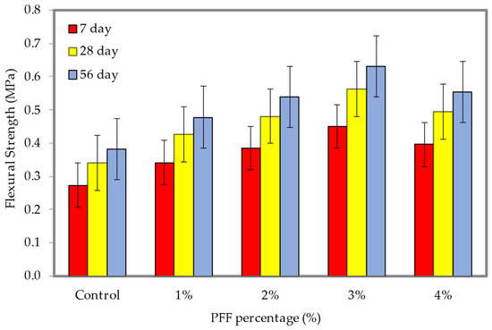 The results of the flexural strength tests at densities of 600 and 1200 kg/m3 are shown in Figure 16 and Figure 17, respectively (the dataset can be found in Appendix A, Table A1). These densities correspond with different weight fractions of PFF. It is clear from looking at Figure 16 and Figure 17 that the inclusion of PFF in foamed concrete led to a rise in flexural strength. For both densities considered in this study, the best weight fraction of PFF was 3%. The flexural strengths of the foamed concrete with the presence of PFF on days 7, 28, and 56 were greater than the flexural strength of the control specimen, regardless of the density of the foamed concrete. In contrast to the control specimen, which only achieved flexural strengths of 0.38 MPa (600 kg/m3) and 1.04 MPa (1200 kg/m3), the ideal flexural strengths that were attained at day 56 were 0.63 MPa and 1.66 MPa, with the addition of a 3% of PFF for the 600 kg/m3 and 1200 kg/m3. PFF is a hydrophilic substance, and as a result, it possesses great adhesion when combined with cement paste. After the PFF percentage was increased to 4%, the flexural strength of foamed concrete drastically dropped for both densities that were taken into consideration for this investigation. Because it is difficult to disperse the PFF evenly and because it might cause agglomeration, the flexural strength will be lowered if the percentage of PFF is too high. This is because PFF can cause agglomeration. During the process of the crack spreading out, the PFF will gradually become separated from the matrix until the bond strength is completely exceeded. This will continue until the fracture has completely spread out. Although the matrix is damaged, it is still capable of maintaining its fundamental form. The presence of PFF in foamed concrete plays a significant role in both the strengthening of the foamed concrete cementitious matrix, and the modification of the material’s physical characteristics from a brittle state to a ductile one. Both of these effects are the result of the material’s transition from a brittle to a ductile state. Because an appropriate percentage of PFF can bond with the hydration products and unhydrated constituents in the foamed concrete matrix to build a three-dimensional grid structure, incorporating an appropriate weight fraction of PFF can efficiently increase the flexural strength of foamed concrete. This is because the three-dimensional network structure can create a subsidiary effect and boost the foamed concrete flexural strength [37].