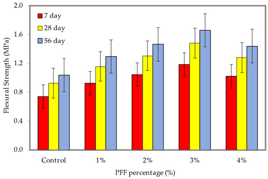 Flexural strength of foamed concrete of 600 kg/m3 density with varying PFF percentages.