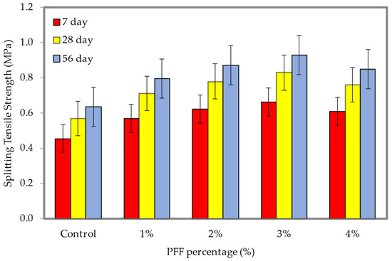 Figure 18 and Figure 19 illustrate the influence that different percentages of PFF have on the splitting tensile strength with densities of 600 and 1200 kg/m3 (the dataset can be found in Appendix A, Table A1). It is clear from the whole trend that with the rise in PF percentages, the splitting tensile strength of both foamed concrete densities at different ages all exhibit an upward trend. This is the case because the PFF percentages are increasing as the trend continues. In most cases, the splitting tensile strength progressively increases with the growth in the percentages of PFF up to 3%. In comparison to the control specimen, which achieved compressive strengths of 0.24 MPa (600 kg/m3) and 0.64 MPa (1200 kg/m3), the optimal splitting tensile strengths attained at day 56 were 0.39 MPa and 0.93 MPa, with the inclusion of a 3% PFF for the 600 and 1200 kg/m3 densities. Because of the enhanced foamed concrete robustness, helped along by the presence of PFF, the enhancement of splitting tensile strengths was accomplished for both materials that were taken into consideration throughout this investigation. PFF will gradually form a fiber grid skeleton inside the foamed concrete as it goes through the process of hardening. This can improve the brittle state of the foamed concrete matrix by governing the growth and propagation of cracks when it is subjected to external tensile stress, preventing the cracks from leading to an explosive failure. It became apparent that the PFF could be uniformly disseminated when the PFF percentage was 3%, which resulted in a growth in the bonding strength between the cement matrix and the PFF. The PFF is dispersed throughout the foamed concrete matrix in a manner that is nearly homogeneous and does not show any significant signs of buildup. In the presence of a tensile load, foamed concrete demonstrates elastic linear tension prior to the onset of plastic deformation, which occurs after the appearance of the first crack in the material. The addition of PFF membrane to foamed concrete, on the other hand, causes the membrane to take on the role of fastening when the foamed concrete cracks. This ensures that the matrix elastic modulus does not immediately drop to zero when the direct boundary strain is reached [38,39,40]. When cracks appear in the PFF membrane, the membrane will bear all the tension and then gradually transmit it to the matrix [8,41,42,43,44,45].