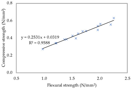 The density of 600 kg/m3 of foamed concrete was used in the execution of a correlation between the compressive and flexural strengths of the material. For the purpose of this investigation, all curing periods were taken into account. The connection between the flexural and compressive strengths of foamed concrete with various percentages of PFF is demonstrated in Figure 20. It seems that they found out that there is a direct expanding, relationship that can be differentiated in the compressive strength and flexural strength of foamed concrete. From Figure 20, it can be seen that an R-squared value of 0.9588 was obtained, which indicates a highly linear relationship between the two strength parameters. This implies that variations in the predictors are interrelated to deviations in the response variable and that the achieved prediction models explain a significant portion of the response’s inherent variability. Because of this relationship, it is clear that the flexural strength of foamed concrete increases as the compressive strength of the concrete increases. This regression model makes it possible to approximate the flexural strength of foamed concrete, based on its axial compressive strength, for the range of values that was investigated in this exploration.