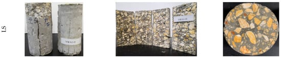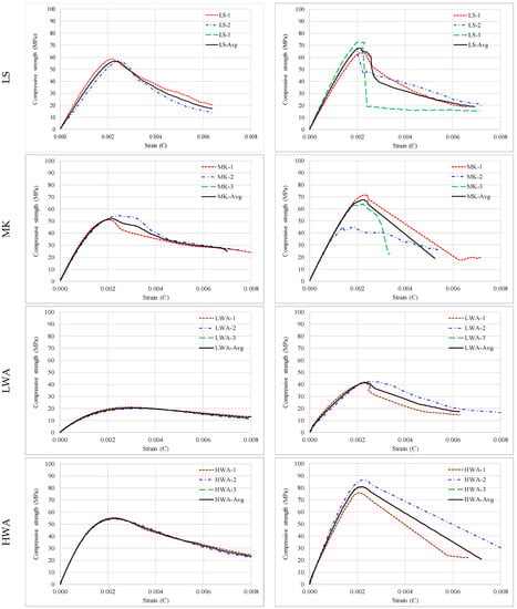The lowest compressive strength was recorded for LWA (21 MPa). It should be noted that the LWA aggregate was very porous, had substantially higher water absorption of 10.6%, and substantially lower abrasion resistance with a mass loss of 45%. The compressive strength drop of the LWA was attributed to a very low coarse aggregate strength compared to the mortar. As the LWA was subjected to the axial compressive loads, stress redistribution within the concrete specimen occurred, and due to the lower stiffness of the LWA, the matrix attracted more stress. The compressive strength of the LWA concrete specimen would be less than the strength achieved if this specimen contained only mortar. This phenomenon has been generally cited in the literature as the limit strength, which corresponds to concrete compressive strength assuming the elastic modulus of both the mortar and coarse aggregate is similar [,,,,].
