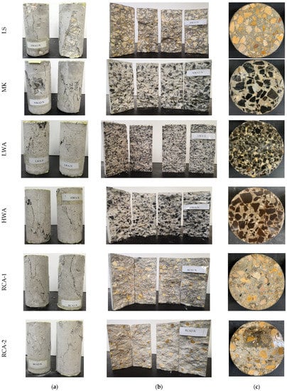 Illustrative photographs of Mix 1: (a,b) compression and splitting tension failure; and (c) cross section.