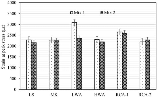The strain at peak stress is the main parameter of the stress–strain response of concrete. The strain at peak stress for Mix 1 and Mix 2 is shown in Figure 7. In general, strain at peak stress decreased as the compressive strength increased regardless of the coarse aggregate type. The strain at peak for Mix 1 and Mix 2 ranged from 2085 to 3080 microstrains and from 2160 to 2585 microstrains, respectively. The difference in the strain at peak stress between Mix 1 and Mix 2 for LS, MK, HWA, RCA-1, and RCA-2 was minor, with a difference of less than 5%. However, the LWA showed a high reduction of 25% in the strain at peak stress between Mix 1 and Mix 2. It is indicated that the strain at peak stress in the LWAs is typically higher than that of NWAs at the same level of compressive strength due to the lower modulus of elasticity of LWAs. The ratio of the strain at peak stress to the compressive strength for LS, MK, LWA, HWA, RCA-1, and RCA-2 mixes produced with rich mix (Mix 2) were 32.0, 33.2, 56.6, 27.2, 40.5, and 54 (microstrain/MPa), respectively. The increase in the strain of RCA-2 concrete compared to RCA-1 is due to the presence of porous mortar on the surface of recycled aggregates. It can be concluded that when the failure of concrete is dictated by the fracture of coarse aggregate, the strain at the peak is relatively comparable between the specimens, regardless of the coarse aggregate type. Nevertheless, there was no clear trend for the concrete specimens in which the ITZ and/or the matrix was the controlling factor.