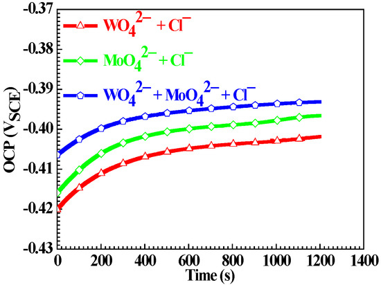 In three solutions, their same pH value suggests the approximate Ee of O2 reduction; therefore, according to Nernst theory, the difference in a stable OCP value is mainly attributed to the different Ee of Fe oxidation. In the subsequent result of potentiodynamic polarization, it will be seen that in WO42− + Cl−, MoO42− + Cl− or WO42− + MoO42− + Cl− solution, the corrosion current density of the Q235 carbon steel decreases in turn, indicating that Fe2+ concentration near the solution/electrode interface decreases in turn. According to Equation (2), it can be calculated that in WO42− + Cl−, MoO42− + Cl− or WO42− + MoO42− + Cl− solution, the Ee of Fe oxidation moves to the positive direction in turn, resulting in the stable OCP value of the Q235 carbon steel that increases in turn.