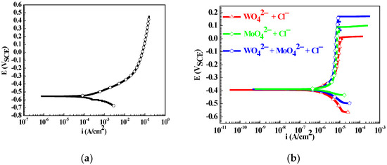 Polarization curve of the Q235 sample in 0.1 mM NaCl solution (a) and cyclic polarization curves of the Q235 samples in WO42− + Cl−, MoO42− + Cl− and WO42− + MoO42− + Cl− solutions (b).