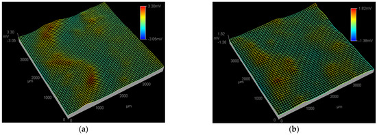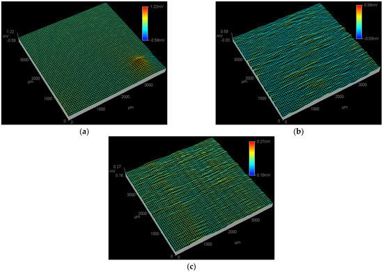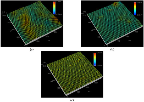 Figure 4 shows the SPD images of the Q235 samples in WO42− + Cl−, MoO42− + Cl− and WO42− + MoO42− + Cl− solutions at the applied potential of 0.09 VSCE. In WO42− + Cl− solution, both the peak potential and affected region of the active pitting sites at 0.09 VSCE are larger than those at 0.01 VSCE, as shown in Figure 4a and Figure 3a, indicating the end of PC initiation and the beginning of PC propagation [46]. At 0.09 VSCE, in the MoO42− + Cl− solution shown in Figure 4b, an active pitting site with the peak potential of 1.16 mV is detected at the top right corner of the ESTM tip scanning region; in the WO42− + MoO42− + Cl− solution shown in Figure 4c, no obvious active pitting sites are observed in the ESTM tip scanning region.