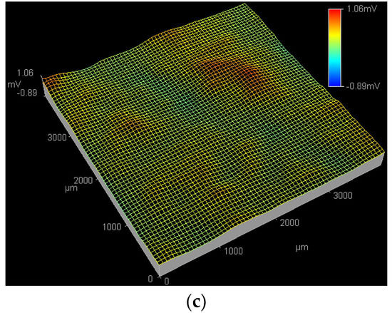 Figure 5 shows the SPD images of the Q235 samples in WO42− + Cl−, MoO42− + Cl− and WO42− + MoO42− + Cl− solutions at the applied potential of 0.17 VSCE. In WO42− + Cl− solution, both the peak potential and affected region of the active pitting sites at 0.17 VSCE further increase compared with those at 0.09 and 0.01 VSCE, as shown in Figure 3a, Figure 4a and Figure 5a, suggesting the continuous propagation of PC [47]. In MoO42− + Cl− solution, both the peak potential and affected region of the active pitting sites at 0.17 VSCE are larger than those at 0.09 VSCE, as shown in Figure 4b and Figure 5b; at 0.17 VSCE, in the WO42− + MoO42− + Cl− solution shown Figure 5c, an active pitting site with the peak potential of 1.06 mV is detected at the middle position of the ESTM tip scanning region.