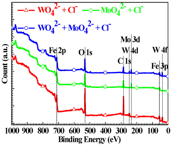 Wide-scan XPS of the Q235 samples polarized to Ep in WO42− + Cl−, MoO42− + Cl− and WO42− + MoO42− + Cl− solutions.