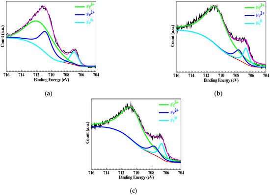 Figure 7 shows the high-resolution XPS of Fe 2p for Q235 samples polarized to Ep in WO42− + Cl−, MoO42− + Cl− and WO42− + MoO42− + Cl− solutions. In the WO42− + Cl− solution shown in Figure 7a, the Fe 2p spectrum of the Q235 sample reveals three peaks at 712.05, 710.85 and 706.95 eV, respectively, corresponding to the Fe element in the valence states of Fe3+, Fe2+ and Fe0 [48]; in MoO42− + Cl− solution shown in Figure 7b and in WO42− + MoO42− + Cl− solution shown in Figure 7c, each Fe 2p spectrum also reveals three peaks corresponding to Fe3+, Fe2+ and Fe0. However, the intensity of the Fe3+ peak in MoO42− + Cl− and WO42− + MoO42− + Cl− solutions is obviously stronger than that in WO42− + Cl− solution; conversely, the intensities of Fe2+ and Fe0 are weaker in MoO42− + Cl− and WO42− + MoO42− + Cl− solutions than in WO42− + Cl− solution. This result implies that the oxidation ability of MoO42− is stronger than that of WO42−, which is also reported regarding their oxidation for stainless steel [49] and cold rolling steel [50], similarly.
