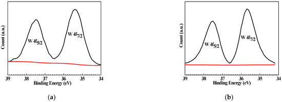 Figure 8 shows the high-resolution XPS of W 4f for Q235 samples polarized to Ep in WO42− + Cl− and WO42− + MoO42− + Cl− solutions. The W 4f spectrum of the Q235 sample exhibits the spin-orbit splitting double peaks of 37.50 eV as well as 35.40 eV in WO42− + Cl− solution and 37.55 eV as well as 35.15 eV in WO42− + MoO42− + Cl− solution, indicating that the W element is present in the passive film of the Q235 carbon steel formed in WO42− + Cl− and WO42− + MoO42− + Cl− solutions.