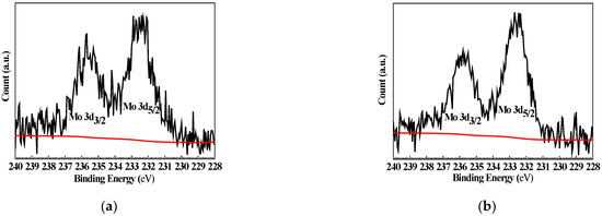 Figure 9 shows the high-resolution XPS of Mo 3d for Q235 samples polarized to Ep in MoO42− + Cl− and WO42− + MoO42− + Cl− solutions. Similar to W 4f, Mo 3d also exhibits spin-orbit splitting double peaks: at 235.70 and 232.40 eV in MoO42− + Cl− solution, and at 235.80 and 232.70 eV in WO42− + MoO42− + Cl− solution.