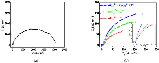 EIS of the Q235 samples in 0.1 mM NaCl solution (a) and in WO42− + Cl−, MoO42− + Cl− and WO42− + MoO42− + Cl− solutions (b).
