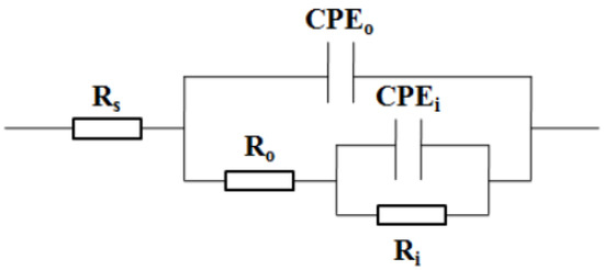 Further, the method of equivalent electrical circuit (EEC) fitting is applied to interpret EIS. Combining the EIS results shown in Figure 10 and our predecessors’ research studies [58], the model of EEC shown in Figure 11 is feasible to EIS interpretation. In Figure 11, Rs represents solution resistance; CPEo and Ro respectively represent the capacitance and resistance of the outer loose layer in the passive film; CPEi and Ri represent the capacitance and resistance of the inner dense layer in the passive film, respectively.