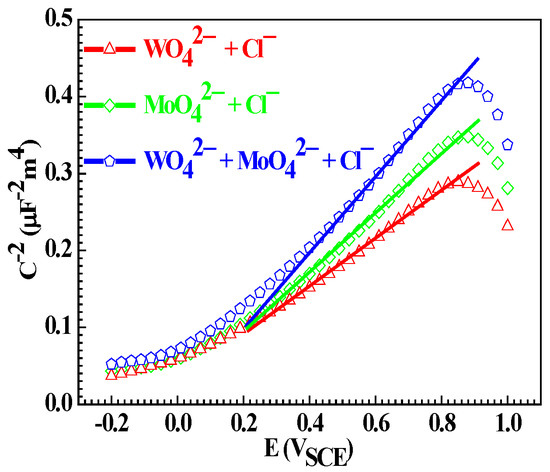 Figure 12 shows the Mott–Schottky plots of the Q235 samples in WO42− + Cl−, MoO42− + Cl− and WO42− + MoO42− + Cl− solutions. For the Q235 samples in three solutions, the slope of the straight line part for each Mott–Schottky plot exhibits a positive value, suggesting that the FeWO4 plus Fe2(WO4)3 film, Fe2(MoO4)3 film and Fe2(WO4)3 plus Fe2(MoO4)3 film satisfy the property of the n-type semiconductor [59]. It is generally accepted that for the passive film of n-type characteristic, its Mott–Schottky plot can be interpreted with the following equation [60]: