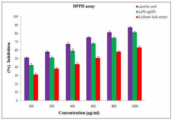 2.5. Antioxidant Activity of Biosynthesized LnFb-AgNPs