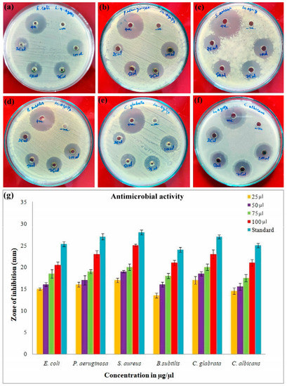 2.6. Antimicrobial Activity of Biosynthesized LnFb-AgNPs