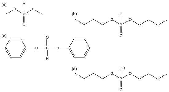 The chemical structures of phosphorus telogens: DMPh (a), DBPh (b), DPPh (c), DBP (d).