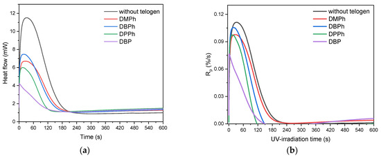 Kinetic studies showed that the UV-photopolymerization of the tested monomers (without telogen) ran faster (Rpmax ca. 0.11%/s) than their UV-phototelomerization (with P-telogens). The maximum reaction rates (Rpmax) in UV-phototelomerization systems were arranged as follows: DBPh (0.10%/s) >DMPh and DPPh (0.09%/s) > DBP (0.07%/s). It is significant that in systems with P-telogen the time to reach the Rpmax was significantly shorter (from 1.2 s for a system with DBP, 18 s for DBPh, 19 s for DPPh, 24 s for DMPh) than during UV-photopolymerization (34 s). Thus, the ability to initiate reactions (Ip, Figure 2d) in systems with P-telogens was significantly higher than in classical photopolymerization. In this respect, the system with DBP stood out. Dibutyl phosphate (DBP) is an ester of phosphoric acid, while the other tested telogens are derivatives of phosphonic acid. During the initiation of telomerization with DBP, photolysis of the P-OH bond took place, and in other cases, the P-H bonds were broken. The photo-DSC studies revealed that in the DBP-APO initiation system, the rapid formation of radicals was also accompanied by a lower maximum reaction rate. Upon reaching it, the reaction rate slowed down quite sharply. This might be due to the quenching of the excited states by collisions of hydroxyl radicals with macroradicals. Consequently, this system was characterized by the lowest double bond conversion value (p) after 5 min of UV irradiation (approx. 44%). The mixture without P-telogen was characterized by the highest value of monomer conversion (53%). Under the given reaction conditions (i.e., at 15 mW/ cm2 of UV-dose and APO concentration) monomers conversion was higher than approximately 50%. Among the samples with phosphonic acid esters (DMPh, DBPh, DPPh) there was a tendency that the larger the alkyl or aryl substituent, the higher the efficiency of reaction initiation (Ip). The reaction also ended faster (rapid decrease of Rp to zero), which means that the value of double bond conversion was lower.