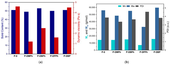 The UV-phototelomerization process in a glass reactor was conducted at the same intensity of UV radiation and temperature as the photo-DSC tests (15 mW/cm2 and 50 °C, respectively). The main difference was the mechanical mixing of the reactants during the process in a glass reactor. The products of this process were solutions of linear P-telomers (oligomers) in unreacted monomers, so-called P-telomers syrups. The aim was to achieve a similar monomer conversion in the syrups, i.e., the solids content (SC) of the telomers syrup. The selected physicochemical properties of the obtained P-telomers syrups (i.e., the solid content and dynamic viscosity), as well as molecular weights and polydispersity of dry telomers are presented in Figure 3. As mentioned above, the SC values were about 50% for each sample, independently of the type of phosphorus compound used in the process, which was most likely due to the amount of photoinitiator used. In contrast, the dynamic viscosity values of telomer syrups varied from 1.2 to 4.6 Pa·s. The highest value of dynamic viscosity was achieved for the reference sample P-0 (4.6 Pa·s), as expected. In general, the telomerization process leads to oligomers rather than polymers, hence the lower viscosity results of telomer syrups (1.2–2.5 Pa·s). The exception was P-DBP syrup, with a viscosity close to that of the reference sample P-0 (i.e., 4.5 Pa·s). Already in the photo-DSC studies, a slightly different course of the process with the participation of DBP telogen was revealed, i.e., very fast formation of reactive radicals. For this reason, longer chains of oligomers may be formed in the system, resulting in a higher viscosity of the telomer syrup. This is confirmed by the results of the molecular weight, presented in Figure 3b; for P-0 polymer and P-DBP telomer similar values of Mn and Mw (14,500 and 56,000 g/mol, respectively), as well as PDI values (3.8 a.u.) were observed. However, significantly lower Mn and Mw values were recorded for the P-DPPh telomer (7000 g/mol and 3300 g/mol, respectively), and PDI value was the highest (4.6 a.u.). The most favorable PDI results were recorded for the DMPh sample (3.3 a.u.). As it is known, organophosphorus compounds are not very effective chain transfer agents [36], which is proved by the presented research.