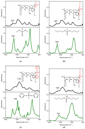 The incorporation of groups derived from P- telogens (DMPh, DBPh, DPPh, and DBP) in the structure of the oligomers was checked by analyzing the FTIR spectra of the tested phosphorus compounds and dry telomers (Figure 4). The telogen spectra revealed peaks in the range 1220–1270 cm−1, attributed to P = O stretching vibrations in the telogen structures (DMPh, DBPh, and DBP), and at a wavelength of 1188 cm−1, derived from P-O-Ar stretching (DPPh). In the case of FTIR spectra of dry telomeres, a slight shift of the above-mentioned peaks (from 13 to 29 cm−1) was observed. It was probably caused by the presence in the structure of linear telomers of hanging hydroxyl groups derived from the HEA monomer [38]. Nevertheless, the FTIR results confirm the formation of phosphorus-containing oligomers, i.e., P-telomers. Their structures are also shown in Figure 4.