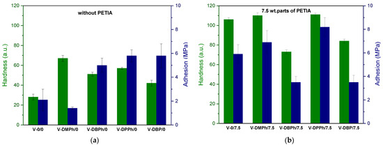 The values of hardness and adhesion of UV-cured varnish coatings: without crosslinking monomer PETIA (a), with 7.5 wt. parts of crosslinking monomer PETIA (b).