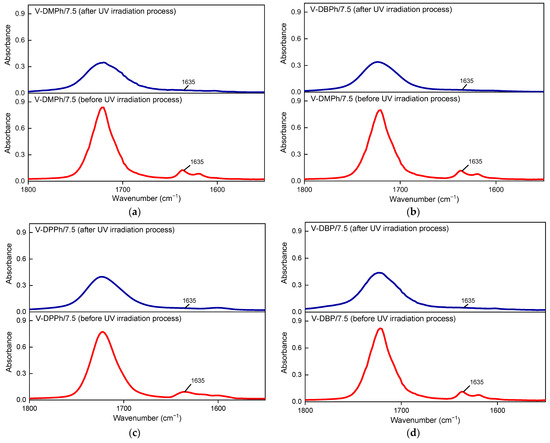 The FTIR spectra of UV-cured varnish coatings (before and after the UV irradiation process): V-DMPh/7.5 (a); V-DBPh/7.5 (b); V-DPPh/7.5 (c); V-DBP/7.5 (d).