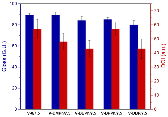 In selected UV-cured varnish coatings containing a crosslinking monomer (total UV dose 6 J/cm2), the influence of the type of P-telomers on the gloss values (at 20°) was investigated. The prepared coatings were characterized by high gloss (from 80 to 89 G.U.) (Figure 7). The results were similar for all samples, regardless of the presence and type of P-telomer. It might therefore be concluded that the monomer composition in the tested systems, in particular the presence of styrene, was responsible for the high results. More significant differences were noted during measurements of the DOI parameter (described as the sharpness or clarity of the image produced by the reflection of an object on a surface varnish coating, the higher the DOI value the varnish coatings are smoother and clearer). Samples with P-DBPh and P-DBP telomers had the same DOI values (43 a.u.), but an increase of that parameter was observed for the varnishes based on P-DMPh and P-DPPh telomers (48 and 57 a.u., respectively). Additionally, the DOI of the reference sample was also 57 a.u. Generally, slight imperfections of tested varnish coatings were observed.