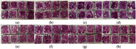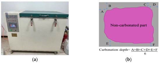 Rapid carbonation was performed using the carbonization test chamber depicted in Figure 3a. Specimens were placed inside the chamber with a certain spacing to ensure the consistent carbonation conditions of their exposed surfaces. The carbon dioxide concentration was maintained at 20 ± 3%, the relative humidity was 70 ± 5%, and the temperature inside the box was maintained at 20 ± 2 °C. The carbonization depth was measured by a 1% phenolphthalein solution indicator. The phenolphthalein indicator reacted with the uncarbonated concrete to become red, and the reaction with the carbonized part of the concrete did not change color. The depth of the colorless part near the edge was measured as the carbonization depth. A calculation diagram of the carbonization depth is shown in Figure 3b.