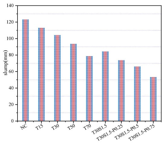 Figure 4 shows that the slump of the NC group concrete was the highest. The slump of iron tailings concrete decreased with an increase in the iron tailings replacement rate, and the slump of T70 concrete was the lowest. The slump values decreased by 8.1%, 15.2%, 24%, and 36%, respectively, when the replacement ratios of iron tailings were 15%, 30%, 50%, and 70%. Similar changes have previously been reported [6,25]. This is mainly because iron tailings sand, compared with natural sand, has a larger specific surface area, a rougher particle texture, smaller fineness, and stronger water absorption [26]. The slump of fiber-reinforced concrete decreased with an increase in the PVA fiber content. Compared with ordinary concrete, when the contents of PVA fiber were 0%, 0.25%, 0.5%, and 0.75%, the slump of the concrete decreased by 31.5%, 40%, 46.3%, and 56.7%, respectively. This was mainly due to the fiber adhesion, tension, and water absorption [27], while the evenly dispersed fibers formed a spatial network structure with a viscous effect within the concrete, thereby inhibiting the flow of concrete mortar.