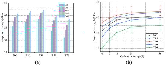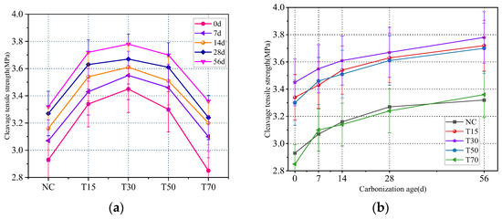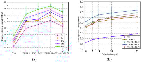 The tensile strength of concrete always maintains a steady growth trend with increasing carbonation ages. As shown in Figure 8b, the strength of the iron tailings concrete increased by 7.8%, 6%, 4.6%, 6.4%, and 10.3% after 14 d of carbonation, while the strength of the fiber concrete increased by 6%, 4.1%, 6.1%, and 6.4% over the same period.