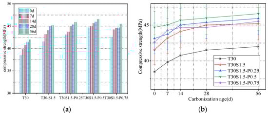 (a) Influence of replacement rate of iron tailings on compressive strength (b) Influence of carbonation age on compressive strength.
