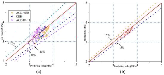 As shown in Figure 9a, based on the test results of this study, these standards tend to overestimate the splitting tensile strength of iron tailings concrete. Equation (2) was obtained through a regression analysis, as shown in Figure 9b, and the error of the proposed formula was within the range of ±5%.