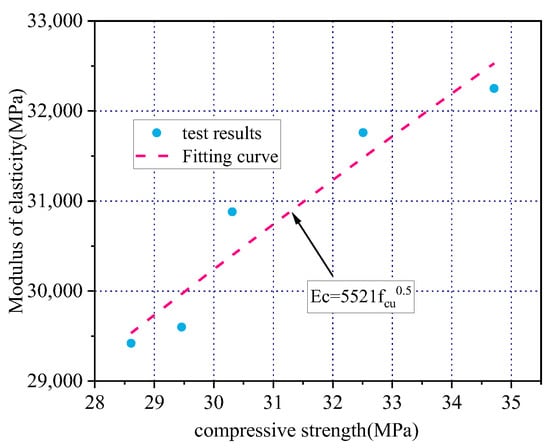 The relationship between the axial compressive strength of concrete and its elastic modulus can be fitted by the least-squares method to obtain the coefficients a = 5521 and b = 0.5 (Figure 10 and Equation (5)). Different countries use different a, b, and c values. For example, in the ACI-363R standard, Ec = 3320fcu^0.5 + 6900, and the error between the experimental and calculated values in the ACI-318-11 standard is Ec = 4370fcu^0.5 (Table 7). The values calculated using the ACI-363R and ACI-318-11 standards are lower than the test values, and the corresponding errors are relatively large. In contrast, the errors between the experimental values and those calculated via Equation (5) in this study are small, ranging from −0.37% to 1.57%.