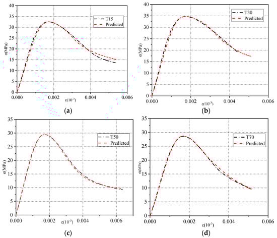 Stress−strain curve and prediction curve: (a) T15; (b) T30; (c) T50; (d) T70.