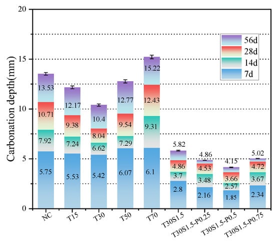 Similar to the cube compressive strength and splitting tensile strength, the axial compressive strength of the prepared concrete specimens first increased and then decreased with an increase in the iron tailings replacement rate and PVA fiber content. According to Table 6, the strengths of the T15 and T30 iron tailings concrete samples increased by 7.3% and 14.5%, respectively; those of the T50 and T70 iron tailings concrete specimens decreased by 2.8% and 5.6%, respectively; and the strength of the fiber-reinforced concrete increased by 7.7%, 11%, 14.7%, and 9.3%. The axial compressive strength steadily increased with an increase in the carbonation age. After 28 d of carbonation, the strength of the iron tailings concrete increased by 14.4%, 16.1%, 9%, 16.3%, and 17.9%, and the strength of the fiber concrete increased by 13.8%, 12.1%, 10.1%, and 10.9%.