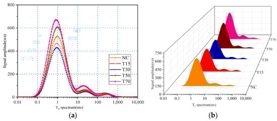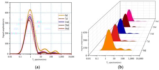 A MacroMR12-150H-I (Suzhou Niumai Analytical Instruments, Suzhou, China) nuclear magnetic resonance (NMR) instrument was used to determine the pore structure of the test block, including its T2 spectrum, porosity, and pore size distribution. NMR primarily monitors the signal produced by hydrogen atoms, which can be used for quantitative measurements of the water content. Before the test, the test block was immersed in water with a temperature of 20 ± 2 °C for 3 d to ensure the uniform distribution of water molecules in the concrete structure.