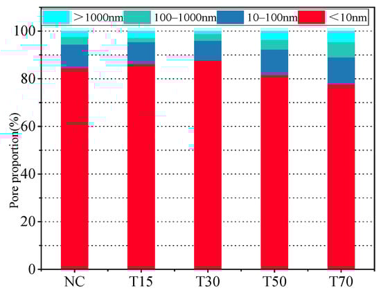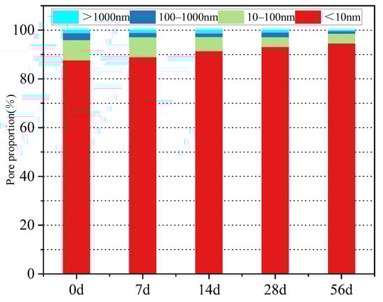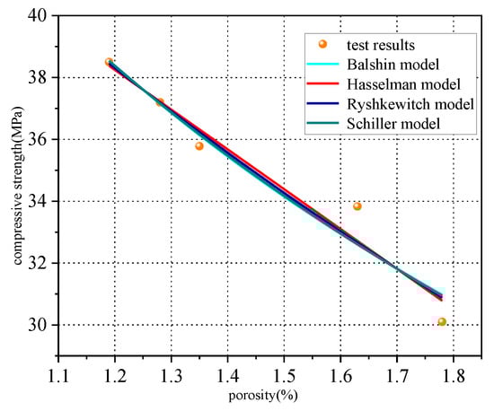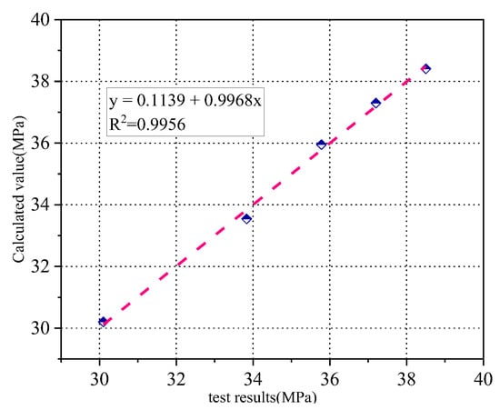 To study the effect of the pore size on the concrete compressive strength, the pores were divided into gel pores (<10 nm), mesopores (10–100 nm), capillary pores, and macropores (>100 nm) [32,41]. Based on the experimental data obtained in this study, a statistical regression analysis was conducted to derive following equation: