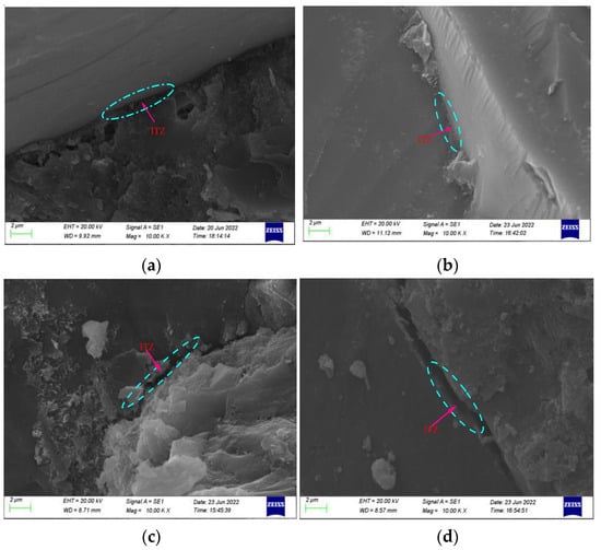 ITZ of iron tailings concretes: (a) NC; (b) T30; (c) T50; (d) T70.