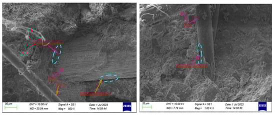 According to the established fiber bonding mechanism, the matrix and fibers in the fiber-reinforced concrete interact with each other through chemical bonding at the interface to jointly bear the applied force. For this concrete type, the mechanical properties of the fiber–cement slurry interfacial transition zone represent a weak link affecting its macroscopic properties. When the concrete is subjected to an external force, shear stress is formed at the interface between the fibers and the matrix owing to the strain difference. This stress is continuously transmitted and weakened along the fiber direction until both the fibers and matrix deform synchronously. Therefore, the bond strength plays a decisive role in the reinforcement and crack resistance of fibers, and the fiber–matrix bond performance mainly depends on the bonding between the fibers and the surrounding materials as well as on the strengths of the materials in the interfacial transition zone. As shown in Figure 22, the fibers are tightly wrapped by the cement paste, which reflects the strong bonding between the steel fibers and the matrix, resulting in a strong interfacial bond and the formation of small cracks at the interface [43,44].